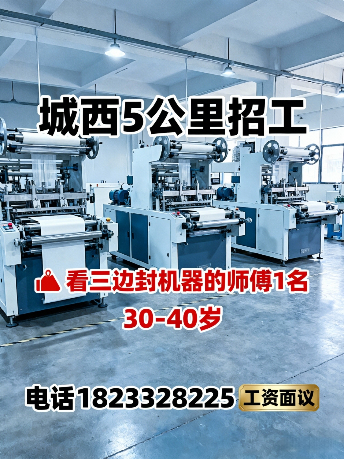招工招一名看三边封机器的师傅30-40岁,工资面议联系电话:*****8225...
