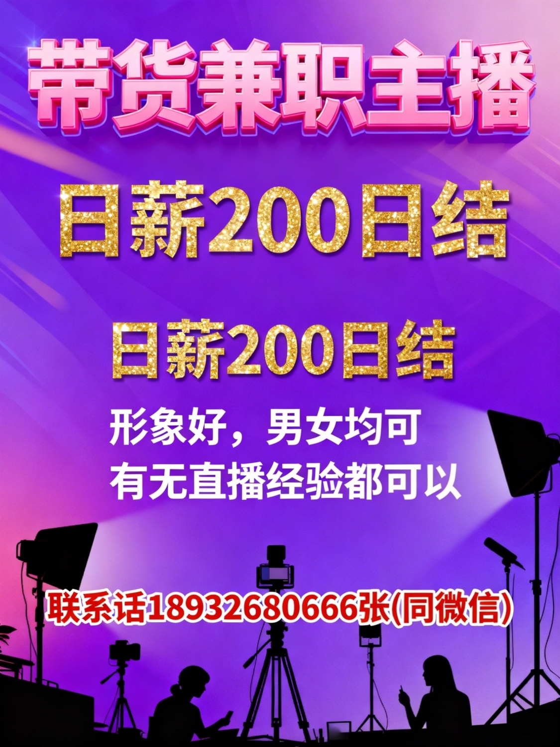 招聘:带货兼职主播,日薪200日结要求:形象好,男女均可,有无直播经验都可以联系电话:*****0666张(同微信)